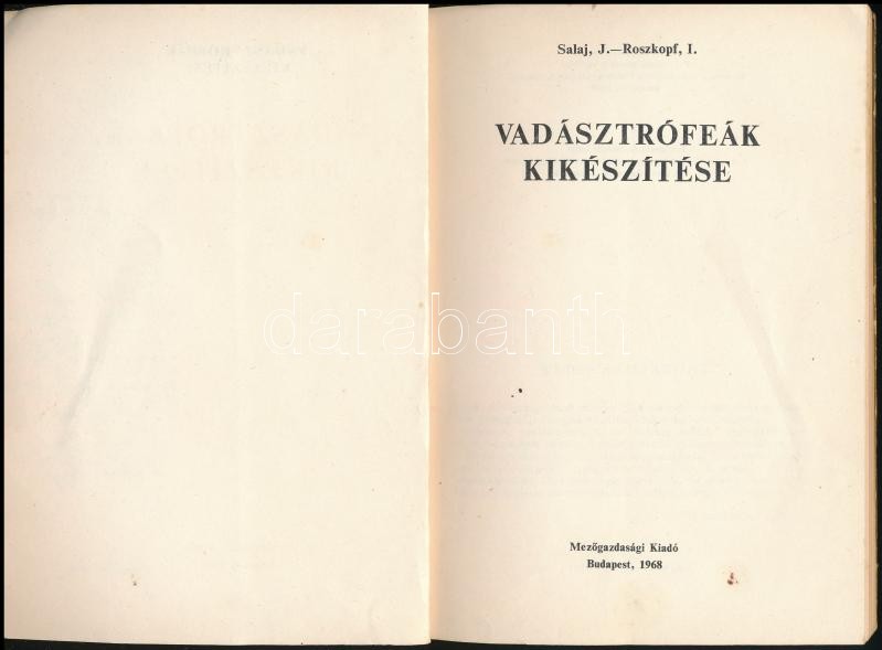 Salaj, J. -Roszkopf I.: Vadásztrófeák kikészítése. Bp.,1968, Mezőgazda... https://www.darabanth.com/hu/320-Gyorsarveres/320.0/Konyvek/Konyvek-Vadaszat~2000008/Salaj-J-Roszkopf-I-Vadasztrofeak-kikeszitese-Bp-1968-Mezogazdasagi-Kiado-SzovegkC3~II1769624