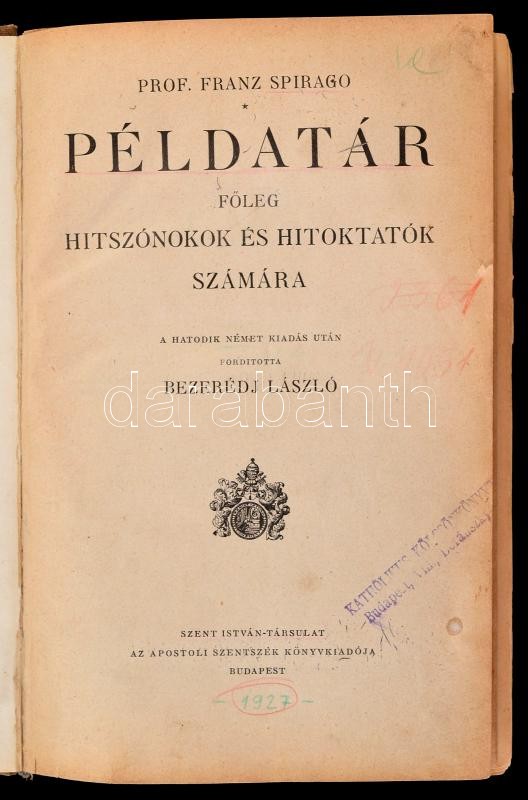 Prof. Franz Spirago: Példatár főleg hitszónokok és hitoktatók számára. Fordította: Bezerédj László. Bp.,1927, Szent István-Társulat, 868+IV p. Átkötött egészvászon-kötés, kopott borítóval, laza kötéssel, egy kijáró lappal, ceruzás aláhúzásokkal, az egyik lap foltos (I./II.)