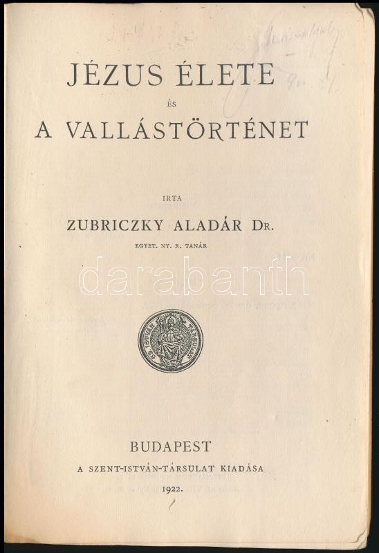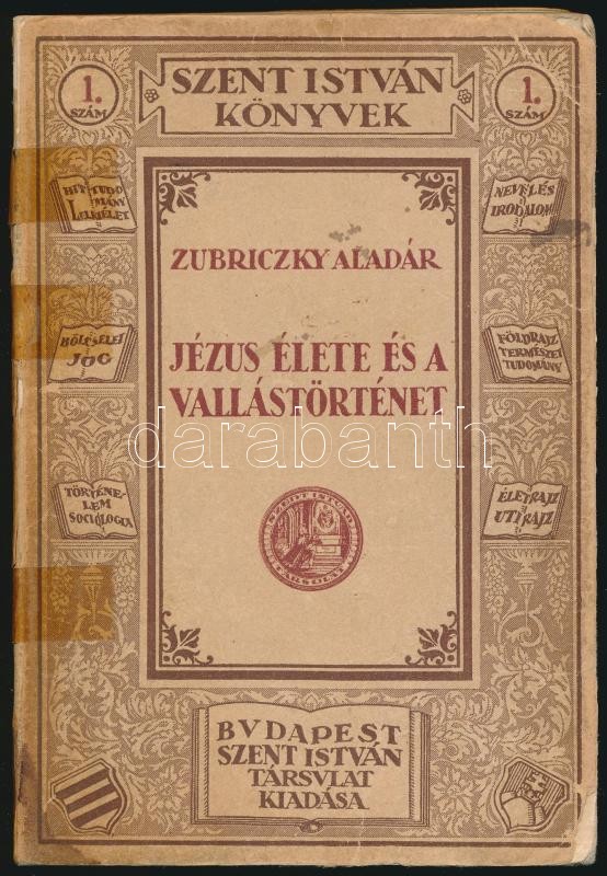 Zubriczky Aladár: Jézus élete és a vallástörténet. Szent István Könyvek 1. sz. Bp.,1922, Szent István-Társulat. Kiadói papírkötés, kopott borítóval, sérült, javított gerinccel.