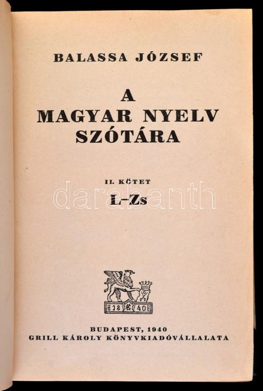 Balassa József: A magyar nyelv szótára II. kötet. Budapest, 1940, Gril... https://www.darabanth.com/hu/320-Gyorsarveres/320.0/Konyvek/Konyvek-es-papirregisegek-rendkivul-alacsony-kikialtasi-aron~2000017/Balassa-Jozsef-A-magyar-nyelv-szotara-II-kotet-Budapest-1940-Grill-Karoly-Atkotott-fe~II1562300