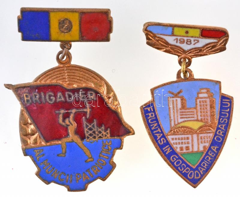 Leírás: Románia 1987. "Kiváló városvezetésért" aranyozott, zománcozott fém jelvény (22mm) + DN "Brigádparancsok / Patrióta munkaerő" aranyozott, zománcozott fém jelvény (~30mm) T:2,2-
