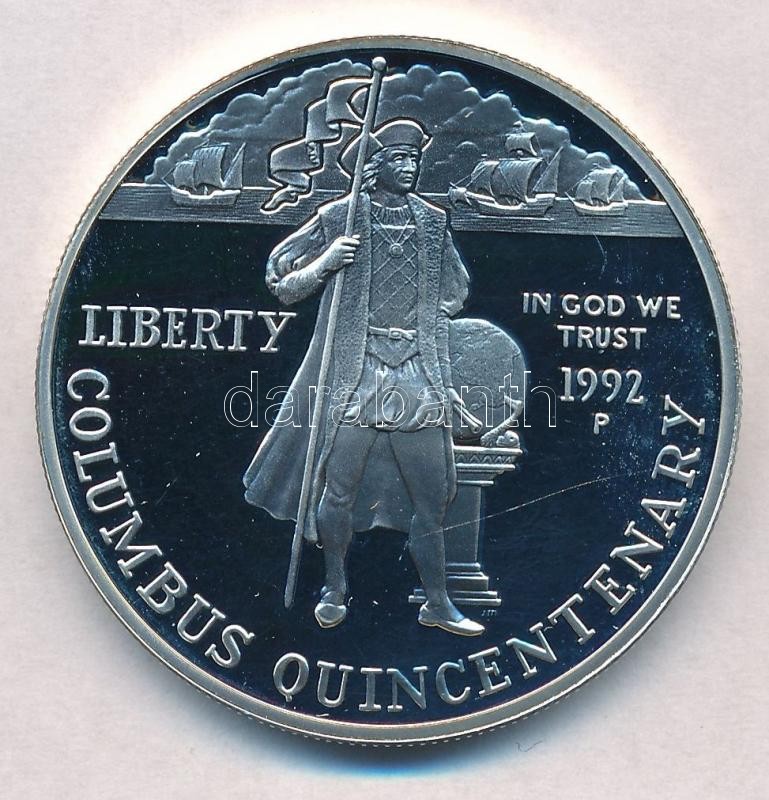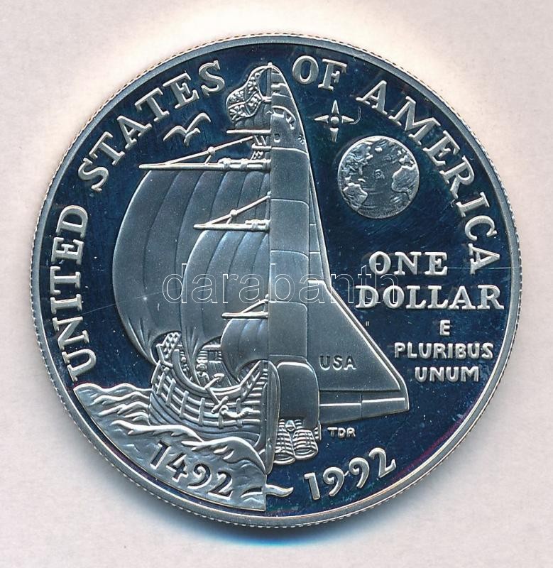 Amerikai Egyesült Államok 1992P 1$ Ag "Kolombusz Kristóf 400. évforduló" német nyelvű tanúsítvánnyal T:PP