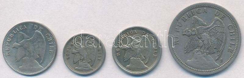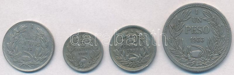 Chile 1913. 20 Centavos Ag + 1928. 5 Centavos Cu-Ni + 1933. 10 Centavos Cu-Ni + 1 Peso Cu-Ni C:XF,VF edge error