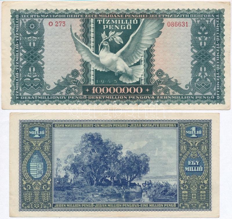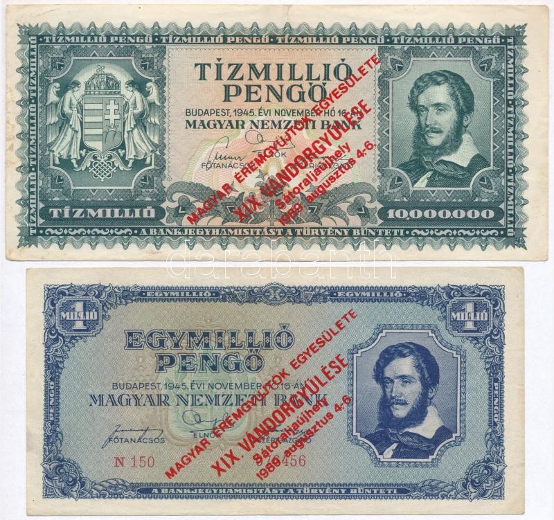 Leírás: 1945. 1.000.000P "Magyar Éremgyűjtők Egyesülete XIX. Vándorgyűlése Sátoraljaújhely 1989. augusztus 4-6." felülbélyegzéssel + 1945. 10.000.000P "Magyar Éremgyűjtők Egyesülete XIX. Vándorgyűlése Sátoraljaújhely 1989. augusztus 4-6." felülbélyegzéssel T:III