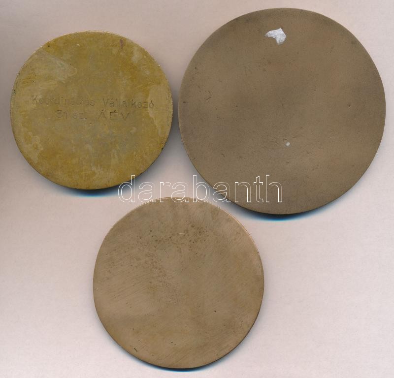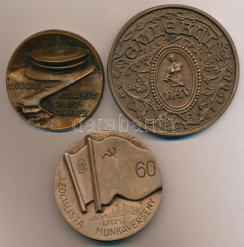 Leírás: 1981. "Budapest Sportcsarnok 1978-1981" Br emlékplakett. Szign.:BH(?) (76mm) + DN "Emlékül - BÁV" Br emlékplakett (97mm) + "Szocialista Munkaverseny" Br emlékplakett (81mm) T:2 patina