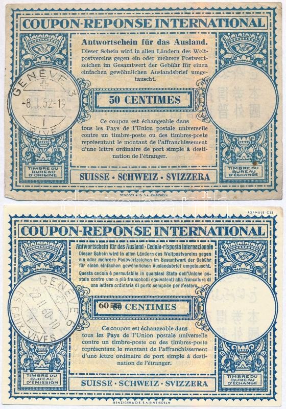 Switzerland ND 50 Centimes + 60 Centimes "International Reply Coupon" both on watermarked paper, with stamp C:XF-F