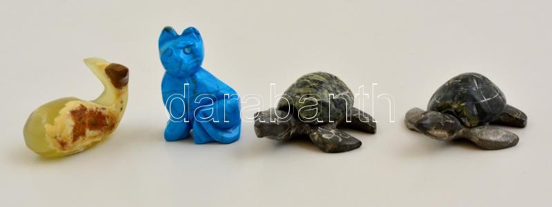 Leírás: Féldrágakő figurák, (macska, 2 db teknős, bálna), 4 db, 4x2 cm és 2x5 cm közötti méretben