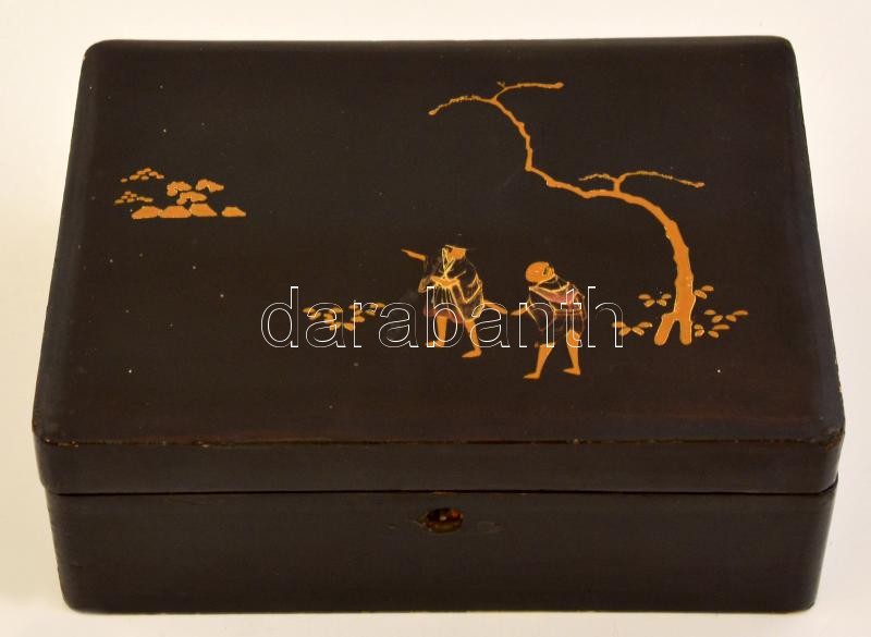 Leírás: Távol keleti lakk fa dobozka, kopott, hiányos zár résszel, 8x17x23 cm