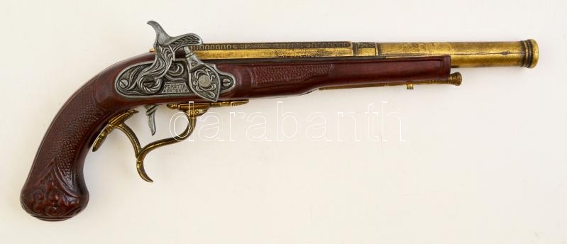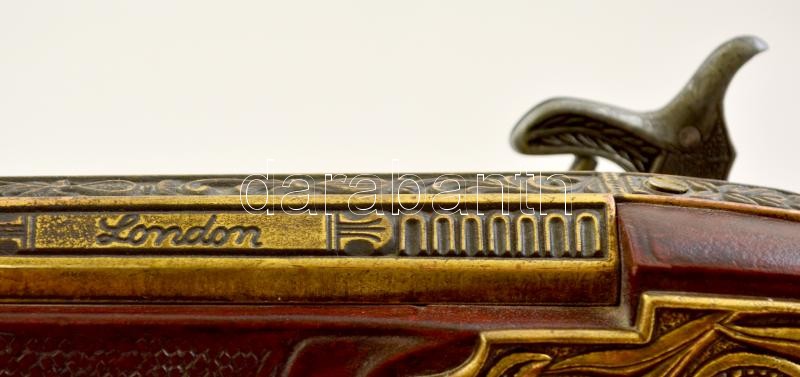 Leírás: Ütőkakasos, elöltöltős pisztoly, díszes replika "London" felirattal, hibás elsütőszerkezettel, fa-fém, h: 33 cm