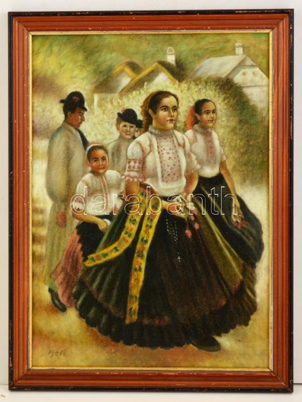 Leírás: Réti jelzéssel: Misére menők népviseletben. Pasztell, papír, üvegezett keretben, 50×34 cm