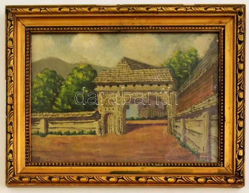 Leírás: Zombor jelzéssel: Székelykapu. Olaj, vászon, üvegezett keretben, 16×22 cm