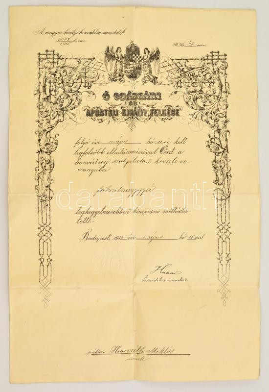 Leírás: 1915 Főhadnagyi kinevezés Hazai Samu honvédelmi miniszter aláírásával