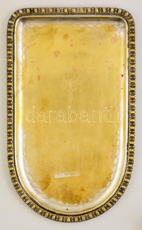 Leírás: cca 1920 Plewkiewicz Warsawie, ezüstözött réz tálca, kopott, jelzett, gravírozott. 44×26 cm