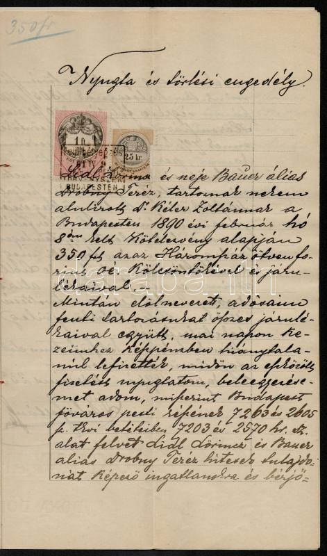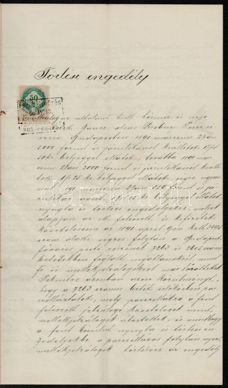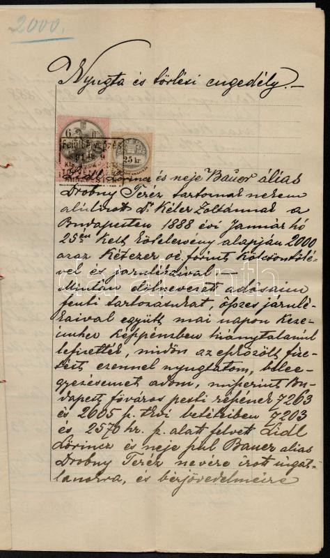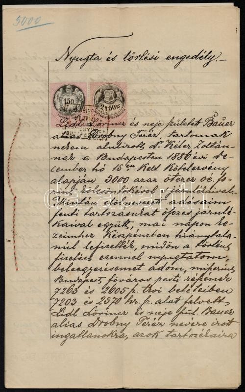 1891-1892 1db 15 ft., 1db 2 ft. 50 kr., 1 db 6 ft.,2 db 25 kr., 1db ft.,1db 50 kr. okmánybélyegek, összesen 7 db, 4 db nyugta és törlési engedély papírokon