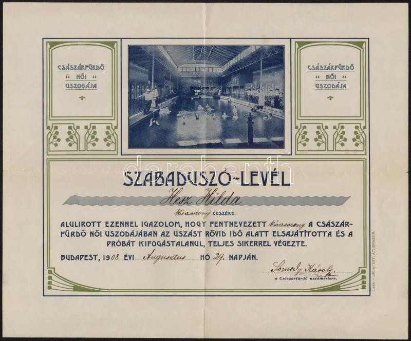 1908 Budapest, a Császárfürdő női uszodájának díszes szabadúszó-okleve... https://www.darabanth.com/hu/321-Gyorsarveres/321.0/Festmeny-mutargy-papirregiseg-egyeb/Okmanybelyegek~500015/1908-Budapest-a-Csaszarfurdo-noi-uszodajanak-diszes-szabaduszo-oklevele~II1779330