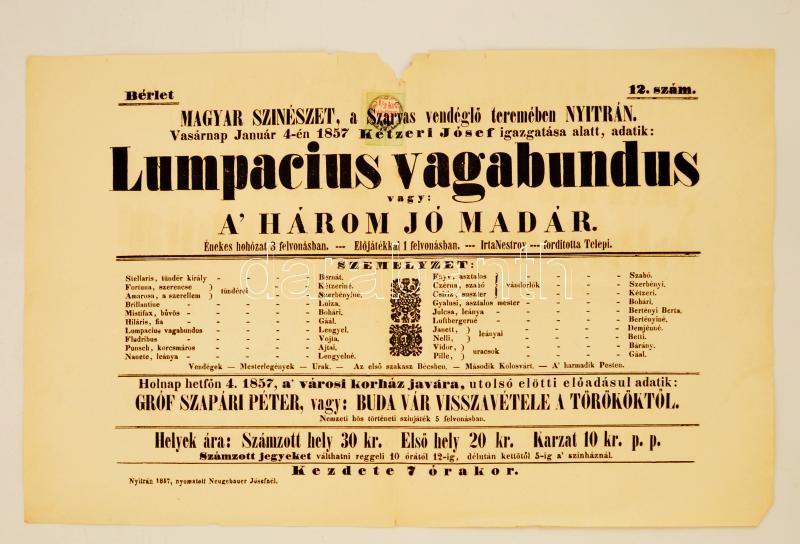 1857 Nyitra. Heltay Jenő: Lumpáciusz Vagabundusz c. előadásának szính... https://www.darabanth.com/hu/321-Gyorsarveres/321.0/Festmeny-mutargy-papirregiseg-egyeb/Okmanyok~500016/1857-Nyitra-Heltay-Jeno-Lumpaciusz-Vagabundusz-c-eloadasanak-szinhazi-plakatja-elobel~II1779859