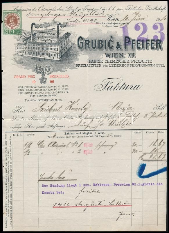 Leírás: 1910 Grubić & Pfeifer Wien díszes fejléces számla, okmánybélyeggel