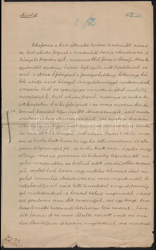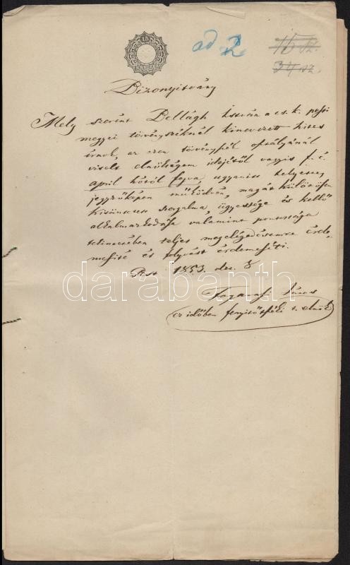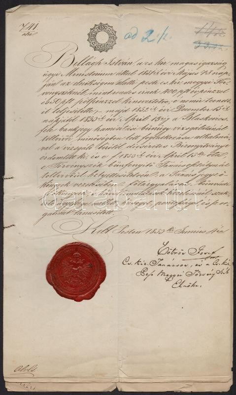 1853 Pest, Főbírósági okirat pénzhamisítási ügyben, rajta Eötvös József (1813-1871) cs. kir. tanácsos, Cs. Kir. Pest Megyei Törvényszék Elnökének aláírásával, szép viaszpecséttel