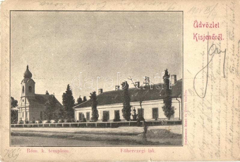 Leírás: Kisjenő, Chisineu-Cris; Római katolikus templom, Főhercegi lak. Kaufmann Manó és Társa kiadása / Catholic church, Archduke's residence (EK)