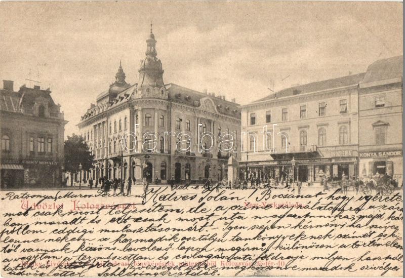 Leírás: Kolozsvár, Cluj; New York szálloda, Kónya Sándor, Schuster Emil, Csiky Mihály üzlete, Drogéria (gyógyszertár). Dunky Fivérek kiadása