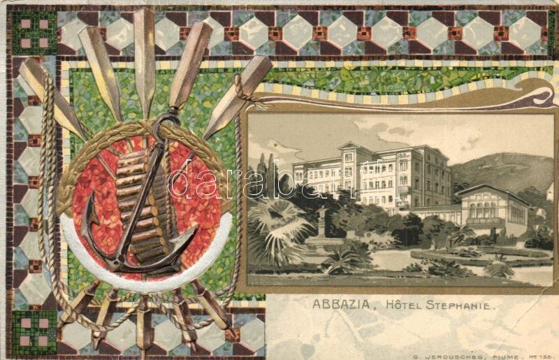 Abbazia, Hotel Stephanie. Hajólapátos, vasmacskás dombornyomott, szecessziós litho keret. G. Jerouscheg, Fiume No. 155. / Paddle with anchor. Emb. Art Nouveau litho frame (EK)