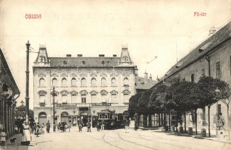 Leírás: Budapest III. Óbuda, Fő tér, Takarékpénztár, Reb Károly üzlete, villamos (EK)