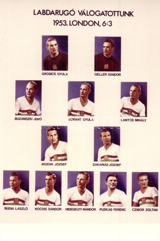 1953 Magyar Labdarúgó Válogatott Londonban 6:3, Aranycsapat. Puskás, Grosics, Hidegkuti / Hungarian national football team, Golden Team. Modern postcard