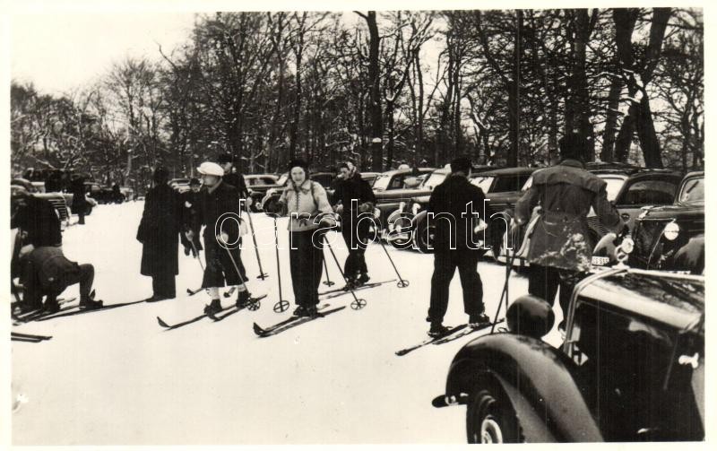Leírás: Téli sportélet a Normafánál (Budapest-Svábhegy), síelők, automobilok / winter sport in Budapest, skiing, skiers, automobiles (EK)