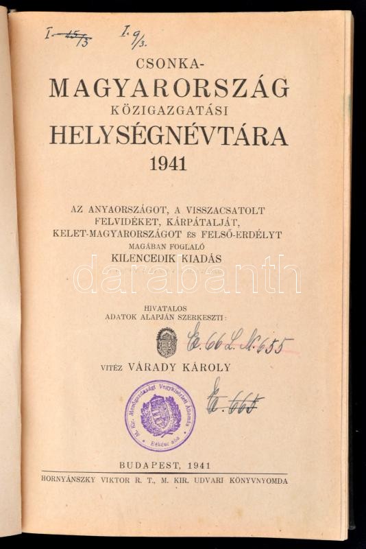 Leírás: Csonka-Magyarország közigazgatási helységnévtára 1941. Szerk.: Várady Károly. Bp., 1941, Hornyánszky Viktor. Kopott vászonkötésben.