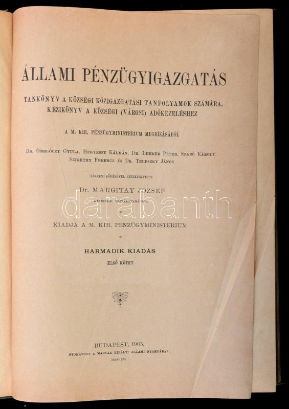 Állami pénzügyigazgatás. I-II. kötet. Tankönyv a községi közigazgatási tanfolyamok számára, kézikönyv a községi (városi) adókezeléshez. Szerk.: Dr. Margitay József. Bp.,1905, M. Kir. Állami Nyomda. Harmadik kiadás. Kiadói egészvászon-kötés, Gottermayer-kötés, kissé kopott, kissé foltos borítóval. Gróf József (1892-1944): Ex Libris Dr. Körmendy. Klisé, papír, jelzett a nyomaton, 9x7 cmx2. Gróf József magyar grafikus, belsőépítész, bélyegtervező, bútortervező. Iparművészeti Főiskolán tanult 1909-1912 között. 1924-től a Műcsarnokban mutatta be grafikáit. A Magyar Grafika, a Magyar Iparművészet és német szakmai lapok is ismertették grafikai munkásságát. Deportálták, 1944-ben halt meg Mauthausenben.