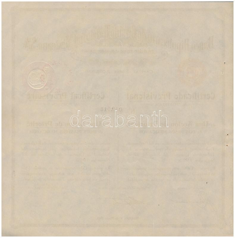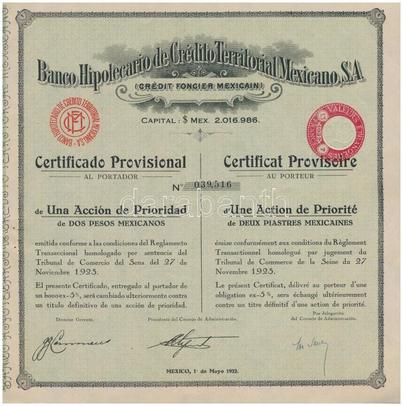 Mexikó 1932. "Banco Hipotecario de Crédito Territorial Mexicano, S.A. (Mexikó Területi Hitelek Jelzálogbankja)" ideiglenes bizonyítvány 2P-ról, spanyol és francia nyelvű, szárazpecséttel T:II- tűly.