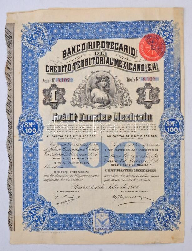 Mexikó 1932. "Banco Hipotecario de Crédito Territorial Mexicano, S.A. (Mexikó Területi Hitelek Jelzálogbankja)" reszvény 100P-ról, spanyol és francia nyelvű, szelvényekkel T:III tűly.