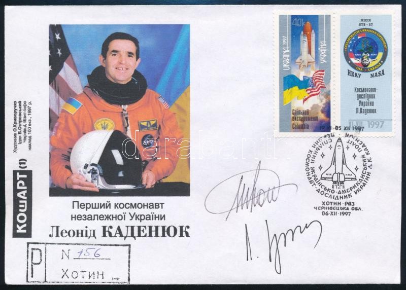 Leonyid Kadenyuk (1951-2018) ukrán űrhajós és Leonyid Kucsma (1938- ) volt ukrán elnök aláírásai emlékborítékon /