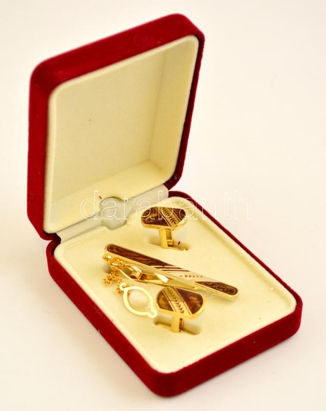 Leírás: Aranyszínű mandzsettagomb párban, nyakkendőtűvel, eredeti bársony dobozában, jó állapotban