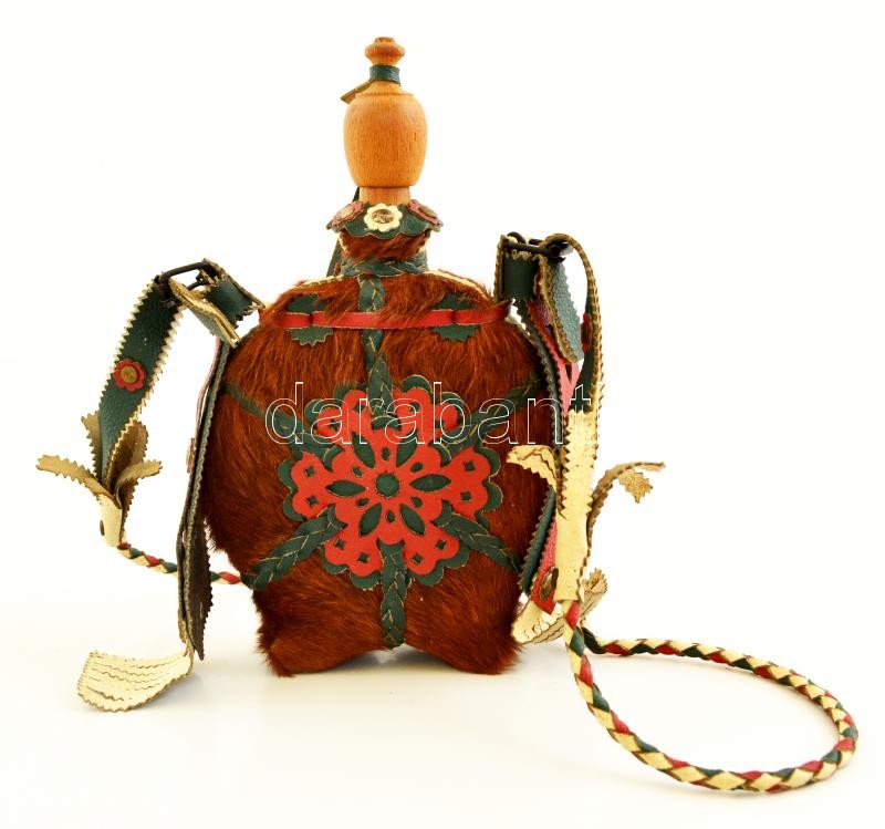 Leírás: Fa kulacs bőr és szőr rátétekkel, jó állapotban, m: 27 cm
