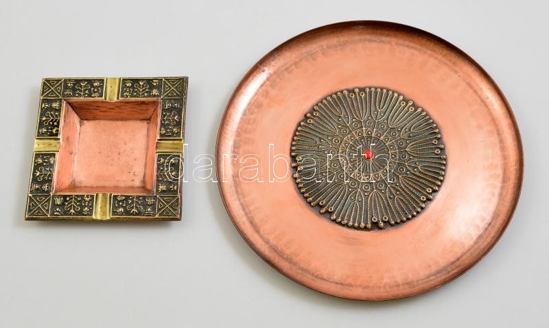 Leírás: Iparművész réz tálca, jó állapotban, 2 db, d: 23,5 cm, 12x12 cm