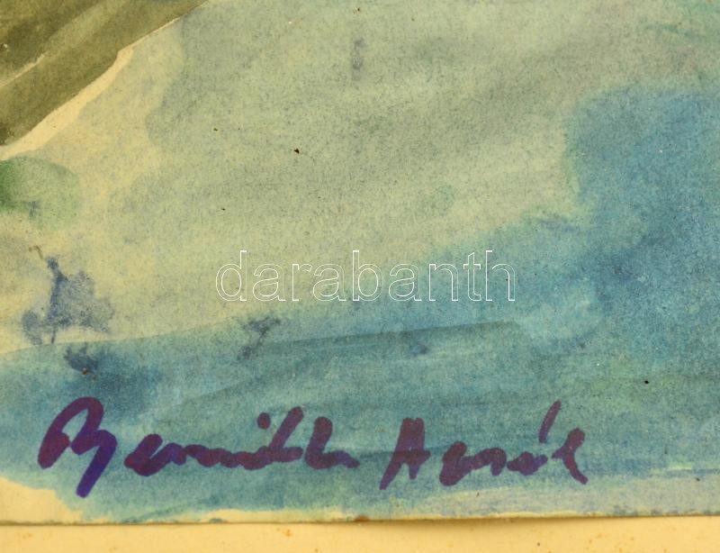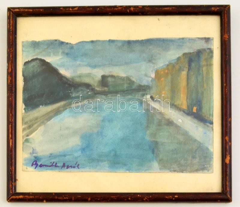 Leírás: Bernáth jelzéssel: Gellért-hegy. Akvarell, papír, üvegezett keretben, 16×22 cm