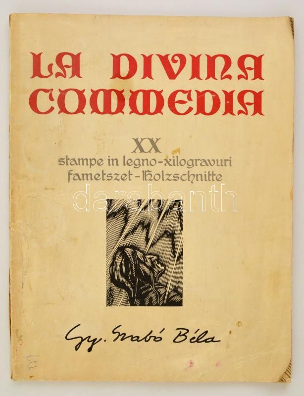 Leírás: Dante Alighieri: La Divina Commedia. Kolozsvár, 1976, Dacia. Gy. Szabó Béla 20 db fametszetével. Papírkötésben, 44x34 cm