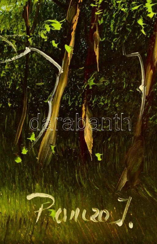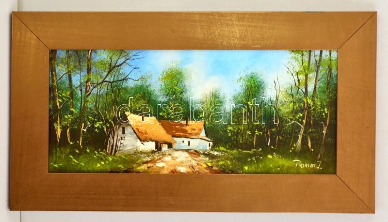Leírás: Pancza Ildikó (1984-): Házak az erdőben. Olaj, farost, jelzett, keretben, 20×45 cm