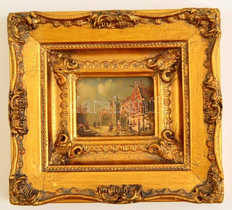Leírás: R.T. jelzéssel: Utcarészlet. Olaj, falemez, keretben, 7×9 cm