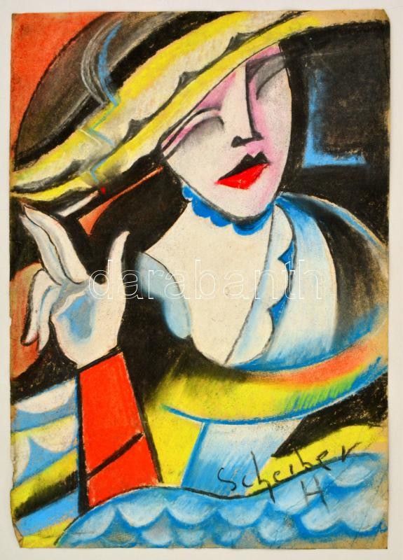 Leírás: Scheiber jelzéssel: Kalapos nő. Pasztell, papír, 43×30 cm