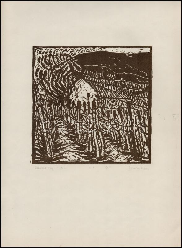 Leírás: Somlai Vilma (1938-2007): Badacsony 1983, linó, papír, jelzett, 19×19 cm