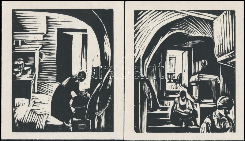 Leírás: Zsögödi Nagy Imre (1893-1976): Szász konyha / Mosónő, 2 db fametszet, papír, jelzés nélkül, 15×12,5 cm