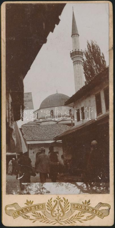 1907 Szarajevó, a Gázi Hüszrev bej dzsámi, keményhátú fotó, hátulján feliratozva, 16,5×8,5 cm / 1907 Sarajevo, the Gazi Husrev beg mosque, photograph with notes on its back, 16,5×8,5 cm