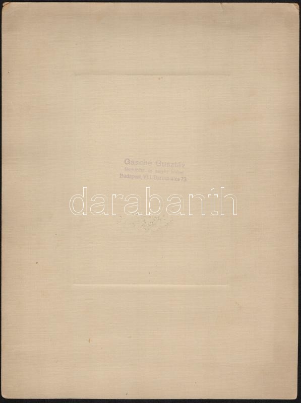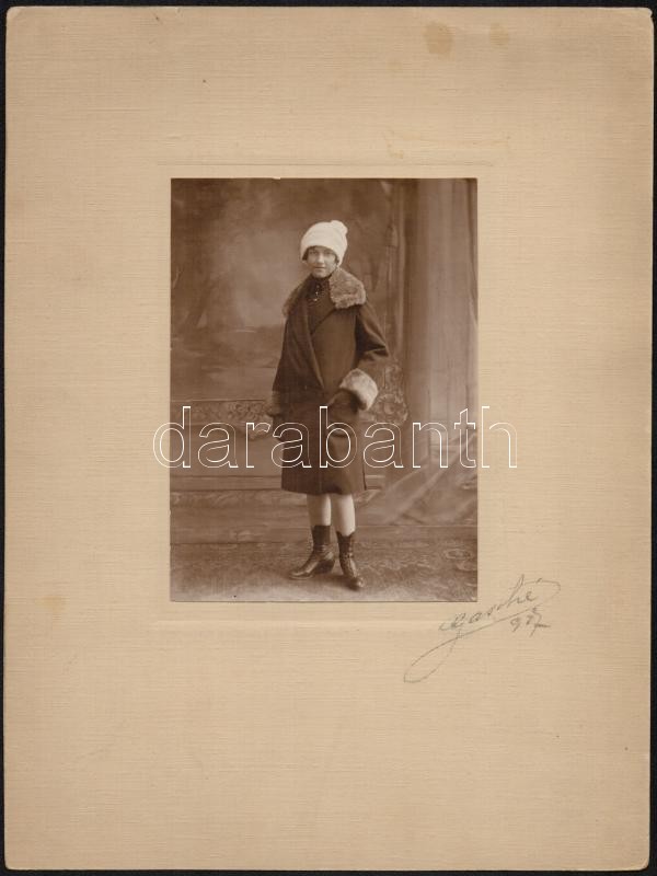 Leírás: 1917 Bp. VIII., Fiatal hölgy bundával díszített kabátban, műtermi fotó Gasché Gusztáv műterméből, pecséttel jelzett, aláírt, 14,5×11,5 cm