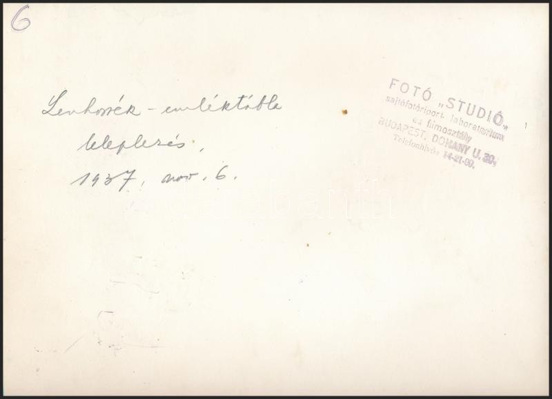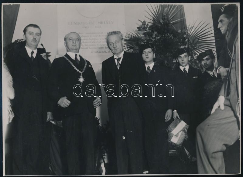 1937 Bp., A Lenhossek Mihály emléktábla felavatása, középen Szentgyörgyi Albert, dr. Kiss Ferenc anatómus, továbbá az egyetem rektora, pecséttel jelzett, feliratozott fotó, 17×23 cm