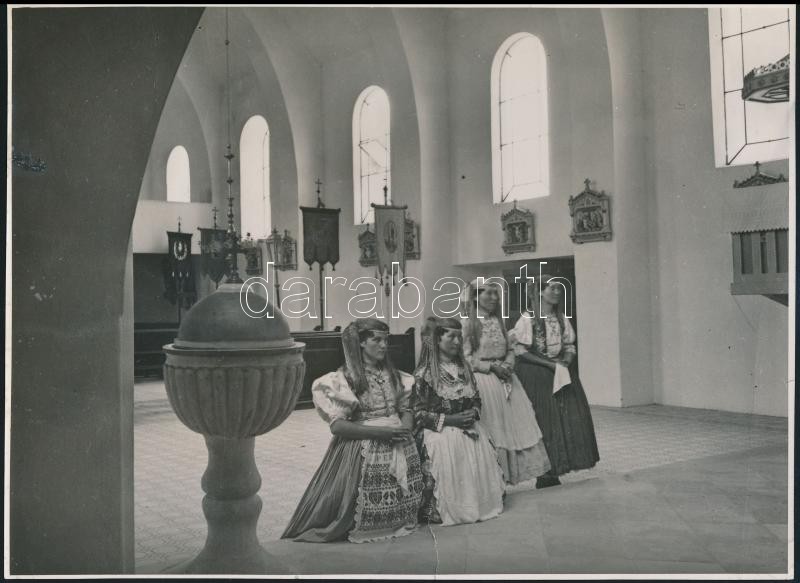 Leírás: Vadas Ernő (1899-1962): Őrhalom, menyecskék a templomban, pecséttel jelzett, feliratozott fotó, 18×24 cm
