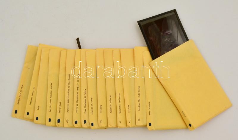 cca 1900 Japánban készült 16 db színezett üveg pozitív fotó. Japán népviselet, szövés, városképek, Mind feliratozott és jó állapotú / 16 colored Japanese glass positive photos. Japan culture, folklore, weawing, town views. 16 pieces