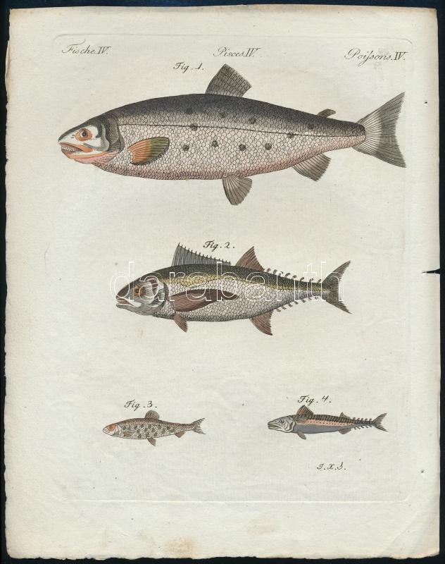 Leírás: 1801 Jacob Xaver Schmuzer (1713-1775): Halak. színezett rézmetszet, papír, jelzett a dúcon, 22x18 cm