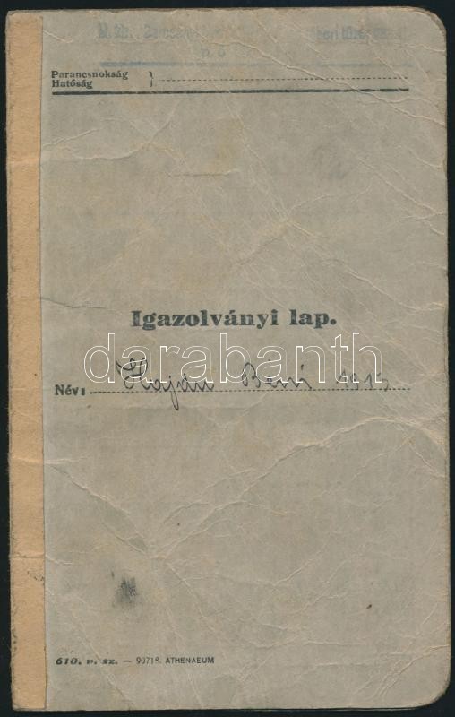 1935 Katonai igazolványi lap, bejegyzésekkel https://www.darabanth.com/hu/322-Gyorsarveres/322.0/Festmeny-mutargy-papirregiseg-egyeb/Militaria~500030/1935-Katonai-igazolvanyi-lap-bejegyzesekkel~II1785038
